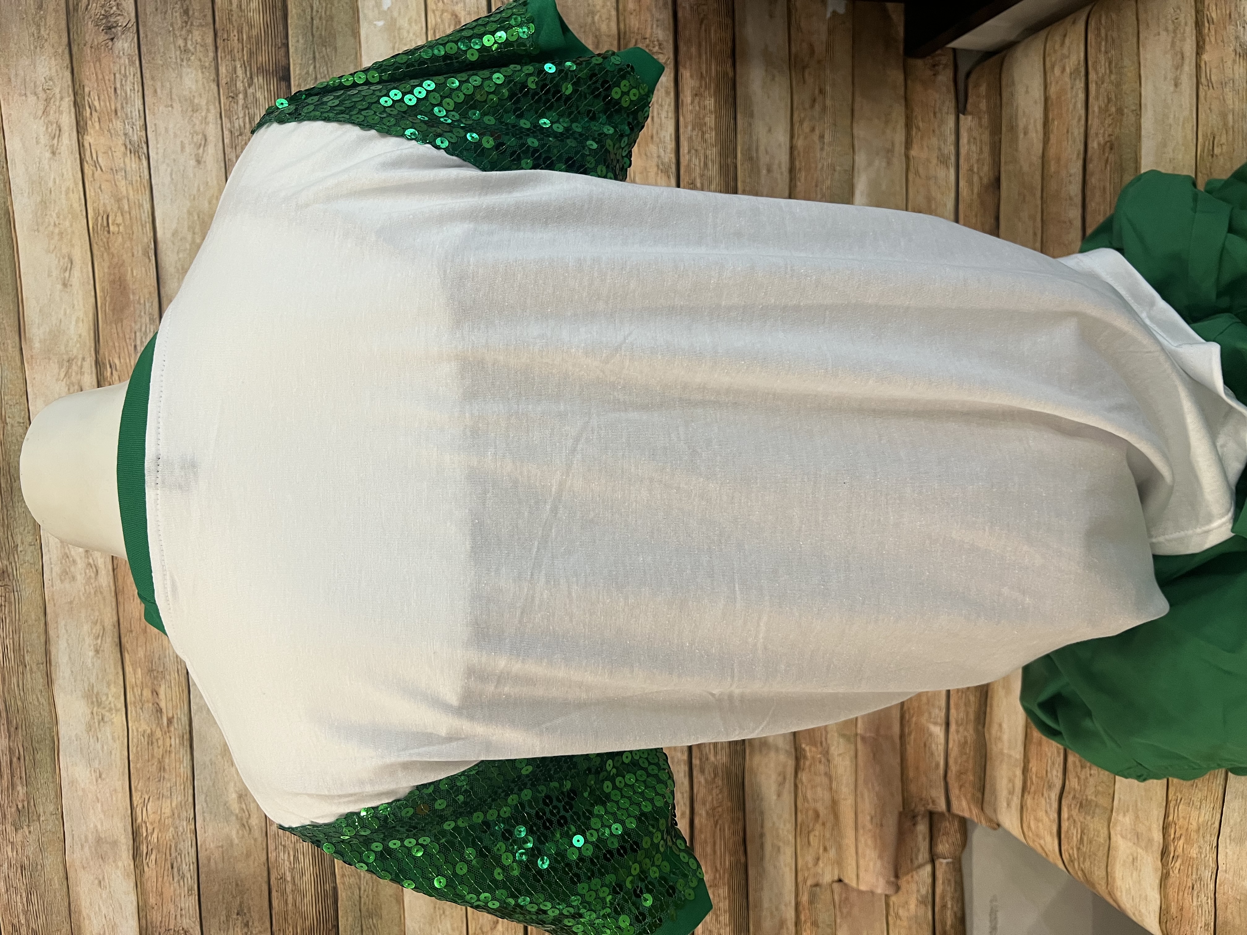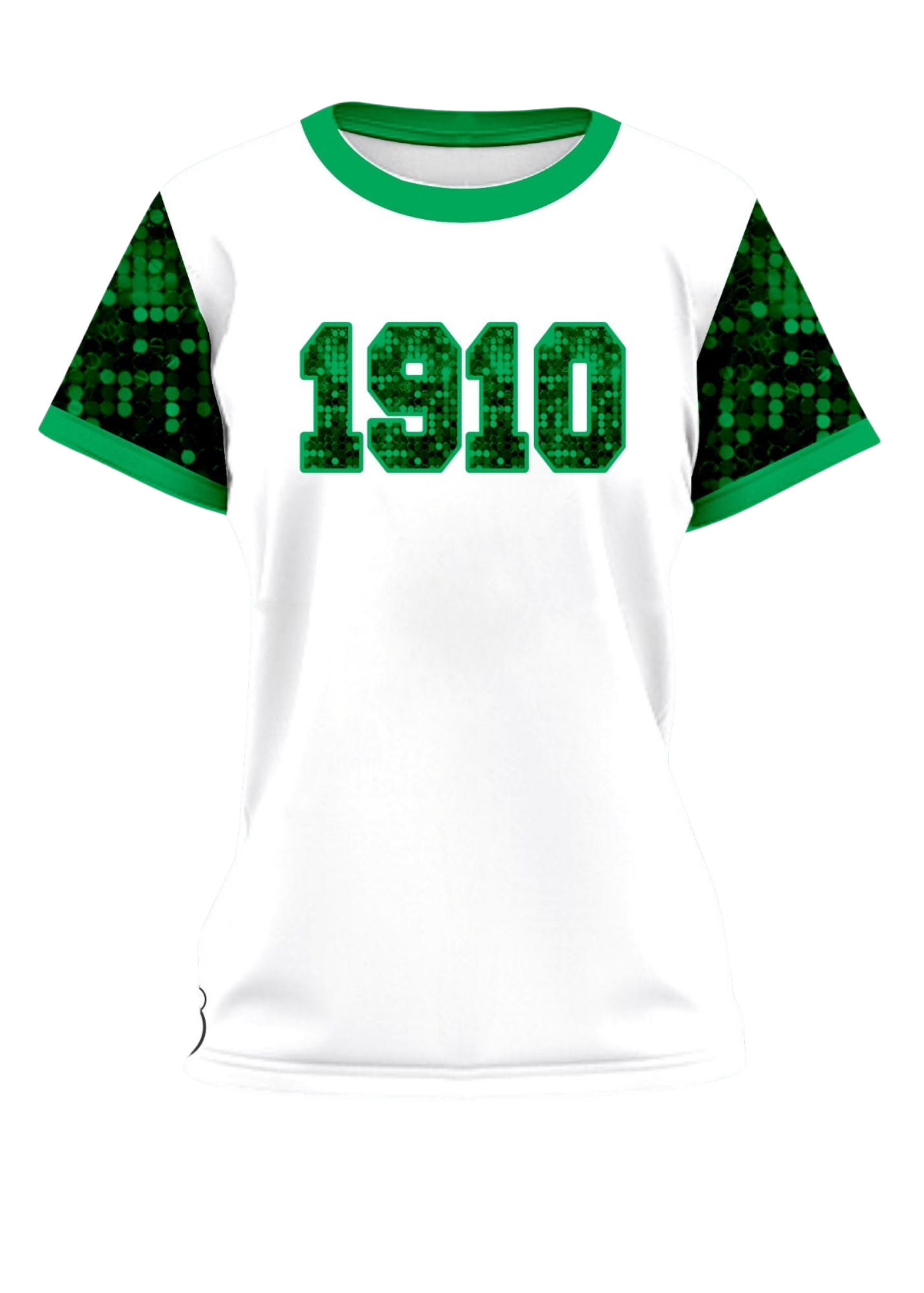 100% Cotton Ringer T-shirt – with green collar, sequin 1910 and sleeves. Shirt fits true to size Sizes S – 3X (limited sizes are available)